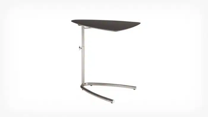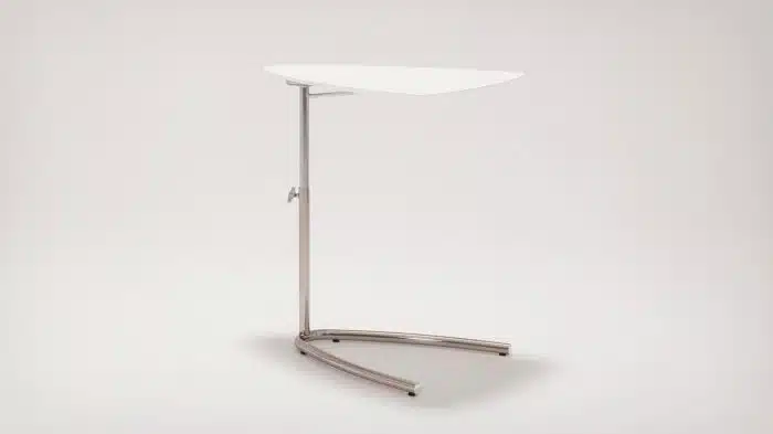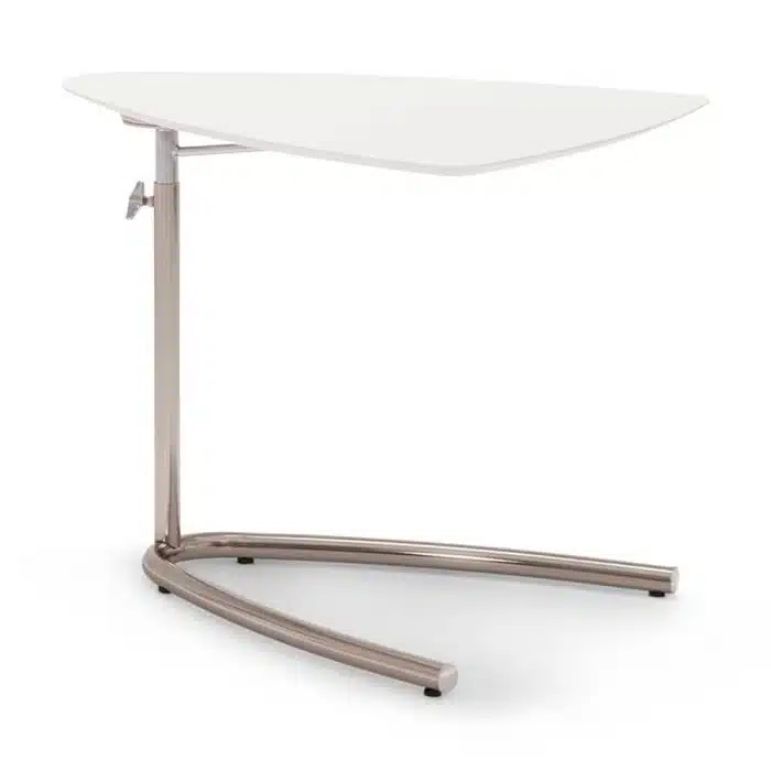 This height adjustable side table offers a variety of functions. The chrome plated metal base and legs provide strength and durability, while its plastic feet protect the floors beneath it.