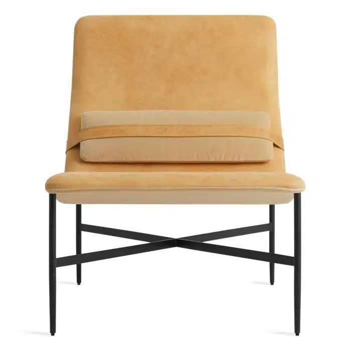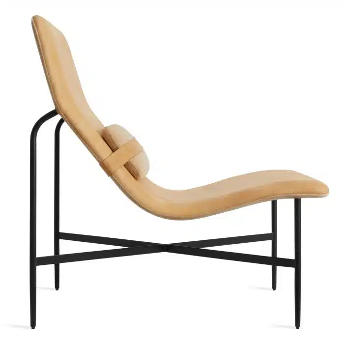Leather wrapped contours form a relaxing position that equally invites introspection and socialization. The contrasting lumbar pillow slides to be where you want it and blackened steel base provides all the support needed to start your journey of taking a damn load off. Chaise lounge chair also available.