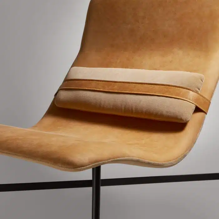 - Camel Leather: An aniline leather that has been burnished and polished to create a cool hand and velvety texture with a slight sheen, enhancing the natural character of the leather; A lovely patina will develop over time; Leather seat with coordinating camel velvet chair back