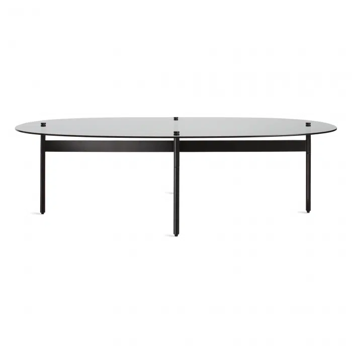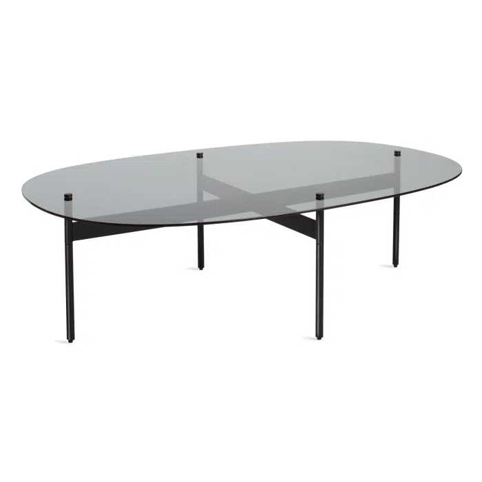 Oval smoked glass tops get eye-catching support from a crisp architectural black powder-coated steel base. The Flume table legs cleverly and unobtrusively attach through the tempered glass top to create an understated yet winsome detail. Side table and round coffee table also available.