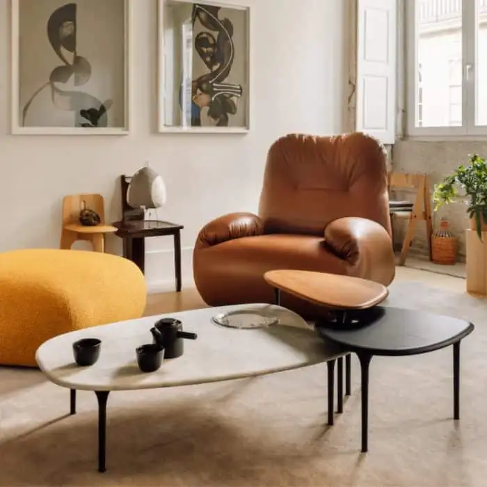 - Upholstered in natural textiles and leathers that accentuate organic lines.
