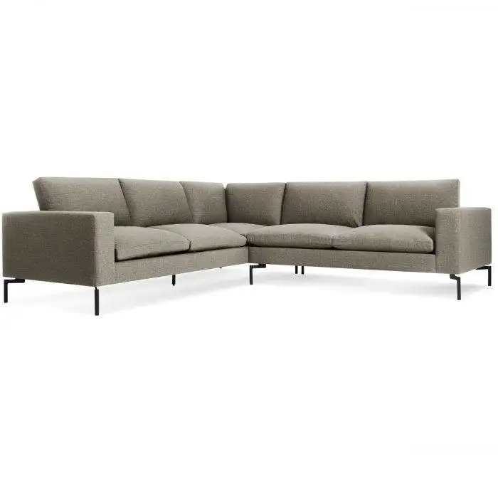 Sometimes it is not about starting from scratch, but rather revisiting past designs and making them better. The New Standard small sectional sofa is simplicity at its best with a twist. Now new and improved. Wide arms and inviting loose cushions all come together with tuned proportions and show stopping legs. Also available in Leather.