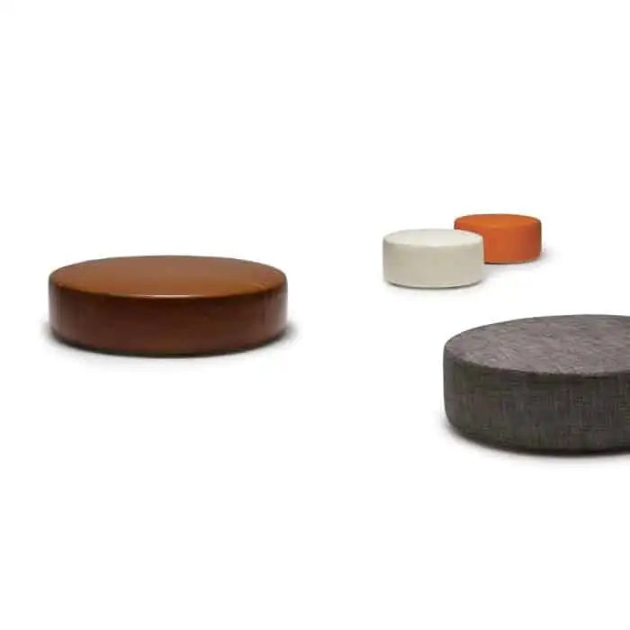 Versatility is the name of the game for the Puck ottoman. Whether utilizing the soft support of the high-resilient polyurethane foam for extra seating or a place to kick up your feet, or taking advantage of the expansive and flat Puck shaped surface serving as a table, the Puck ottoman’s uses are limited only by your imagination. Available in your choice of fabric or leather all with a “T” stitch detail.