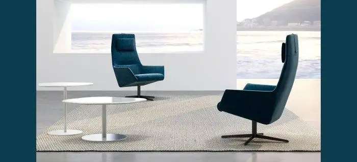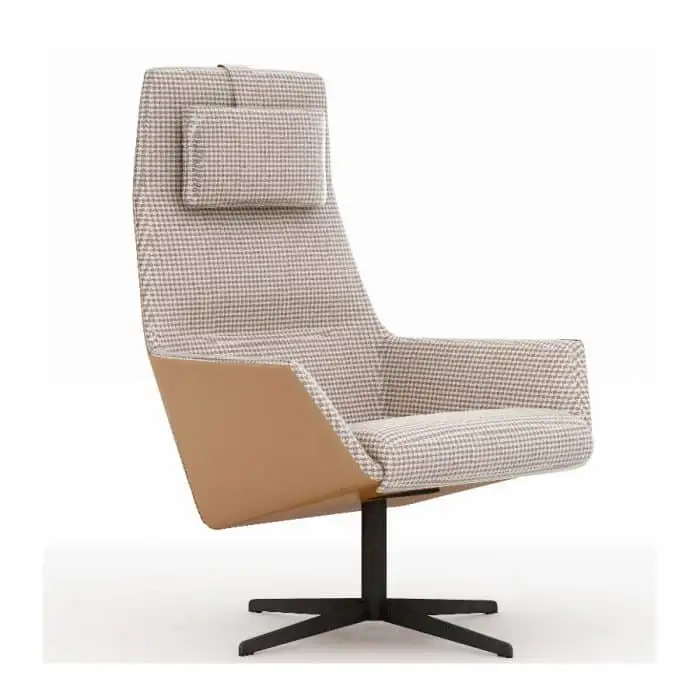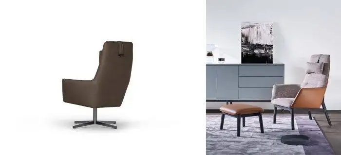 Reminiscent of folded paper origami, the Qing Chair (High Back) is creased at the arms, back and headrest with the utmost comfort in mind. The high back paired with a soft pillow for the head provides neck and shoulder support that is greatly appreciated as you kick up your feet on the optional ottoman. Filled with integrally molded polyurethane foam, the crisp lines of the Qing Chair (High Back) are softened giving supple support to the back and seat only increasing the level of comfort. Available in your choice of fabric, leather or a combination of the two sitting atop either a Grey Oak or black Nickle swivel base. Also available in a low back version or with an optional ottoman.