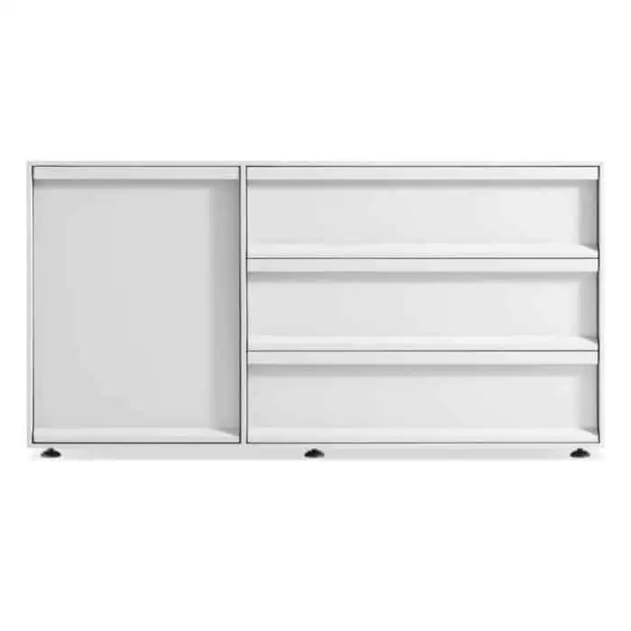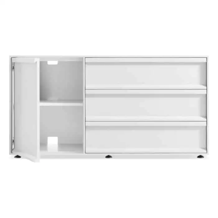 Tranquil staple. Crisp lines and unassuming relief pulls conspire to keep the action behind soft close drawers. A matte painted finish in muted tones delivers serenity and sets up a streamlined storage solution for the living room, bedroom and office.