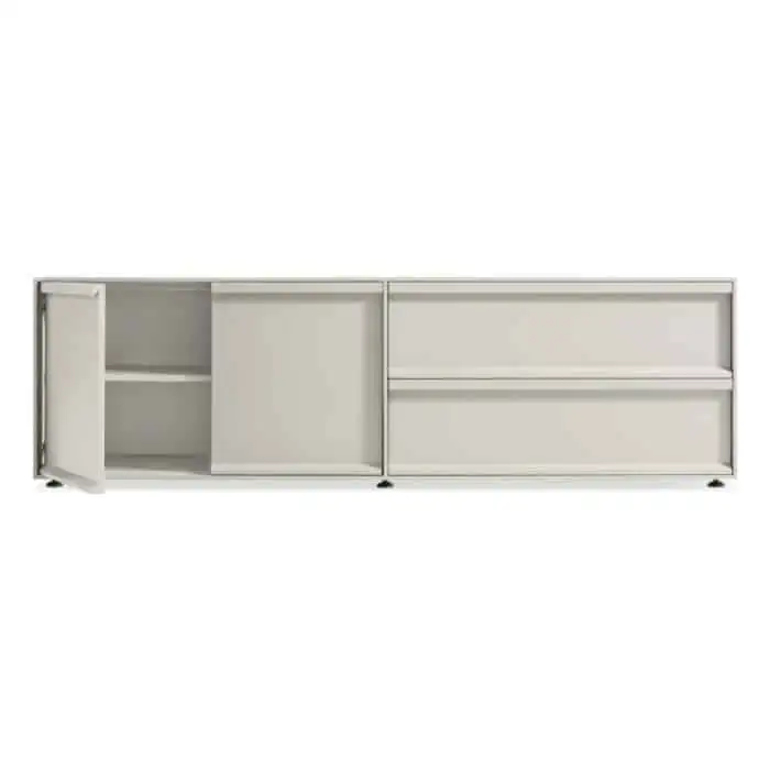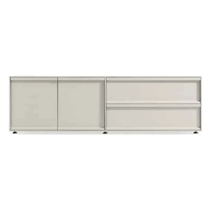 Tranquil staple. Crisp lines and unassuming relief pulls conspire to keep the action behind soft close drawers. A matte painted finish in muted tones delivers serenity and sets up a streamlined storage solution for the living room, bedroom and office.